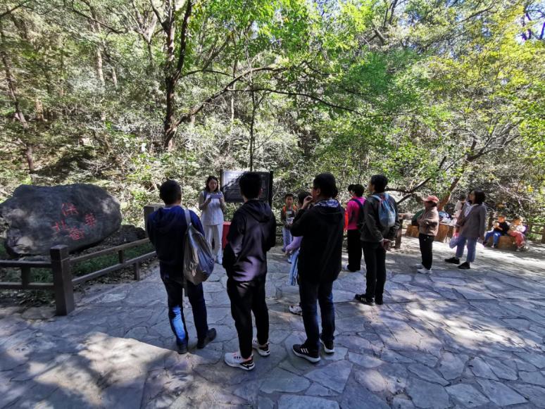 “一二 九”运动纪念地位于北京植物园樱桃沟最深处,这里是北平学联和民先队在“一二 九”运动时期联合举办夏令营,利用多种形式团结教育青年的地方。在活动现场,大家参观了“一二 九”运动纪念亭、刻有“保卫华北”字迹的大青石、革命英雄事迹纪念栏,以及“与历史对话”、“不平静的书桌”等系列雕塑作品。学生党员余卿为大家进行讲解,共同学习回顾了党领导人民群众发动“一二 九”抗日救亡运动、众志成城抵抗侵略的英勇事迹。