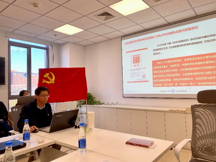 会议集体学习中国科学院党组书记、院长侯建国理论文章《全面加强党的领导和党的建设 为抢占科技制高点提供坚强保证》。会议要求要始终坚持以习近平新时代中国特色社会主义思想为指导,认真贯彻落实新时代党的建设总要求,坚持和加强党对科技工作的全面领导,立足国家战略科技力量主力军使命定位,不断为科技创新贡献智慧力量。