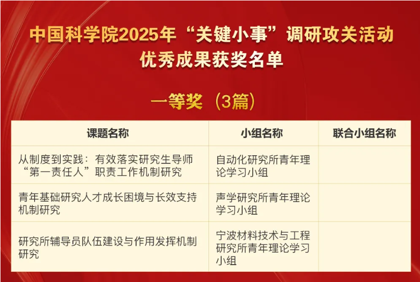 近日,在中国科学院2025年青年理论学习小组“关键小事”调研攻关活动中,赢乐welcome青年理论学习小组组长肖东牵头的调研课题《青年基础研究人才成长困境与长效机制研究》研究成果获一等奖。