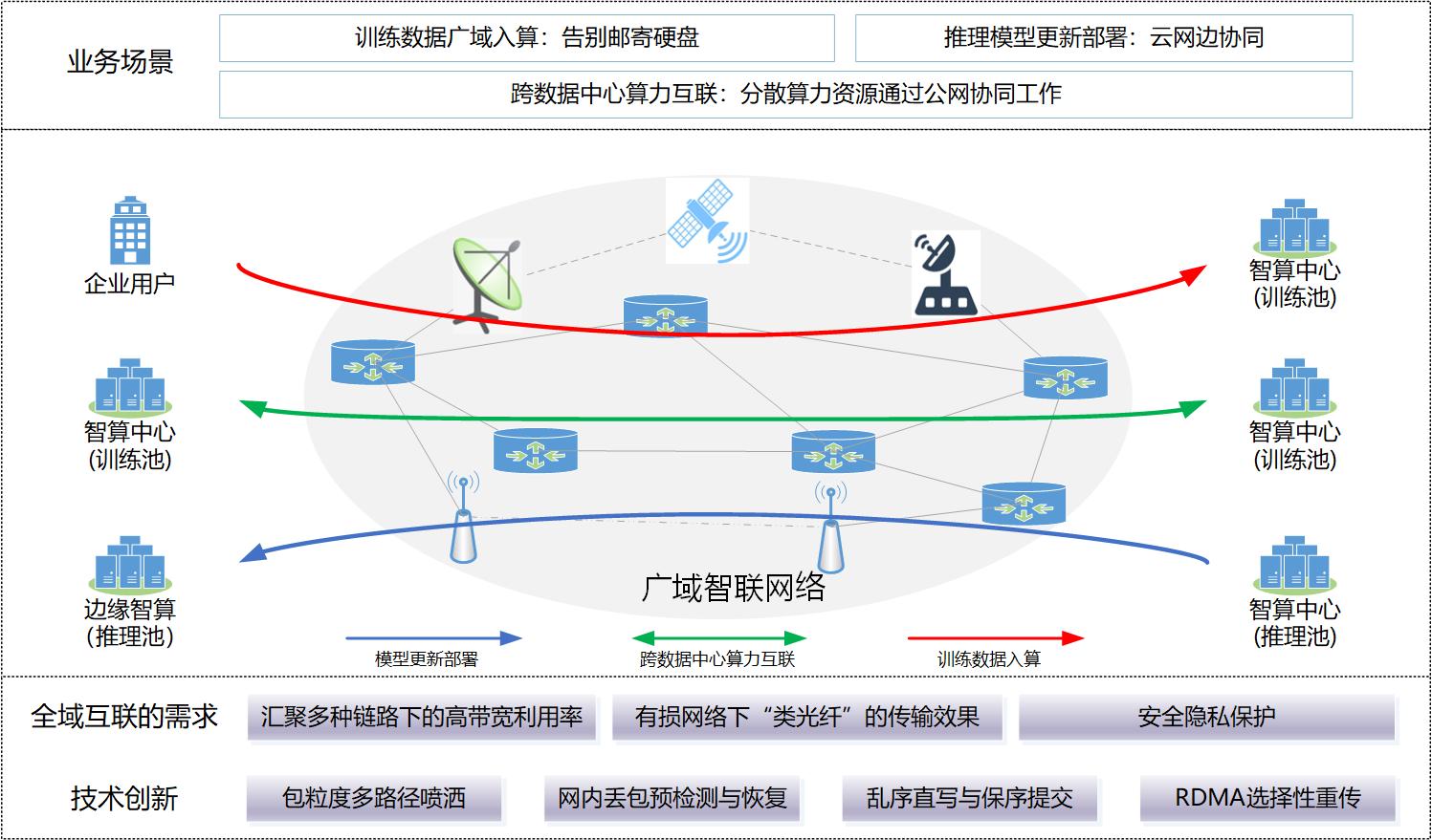 Super RoCE是智能网络与信息处理技术实验室团队基于自主研制的SEANet新型网络体系,形成的“入算、算间、算内”一体化网络解决方案,依托标准以太网架构实现"一网承载多域算力",具备高通量低延迟的传输能力,可解决面向AI泛在化、轻量化下的算力全域高速互联与协同难题,可支撑训推数据远距离入算、跨算力中心互联、算力集群内互联等多种业务场景下的算力网络构建,为AI使能的算力互联应用提供了先试先行的优选案例。