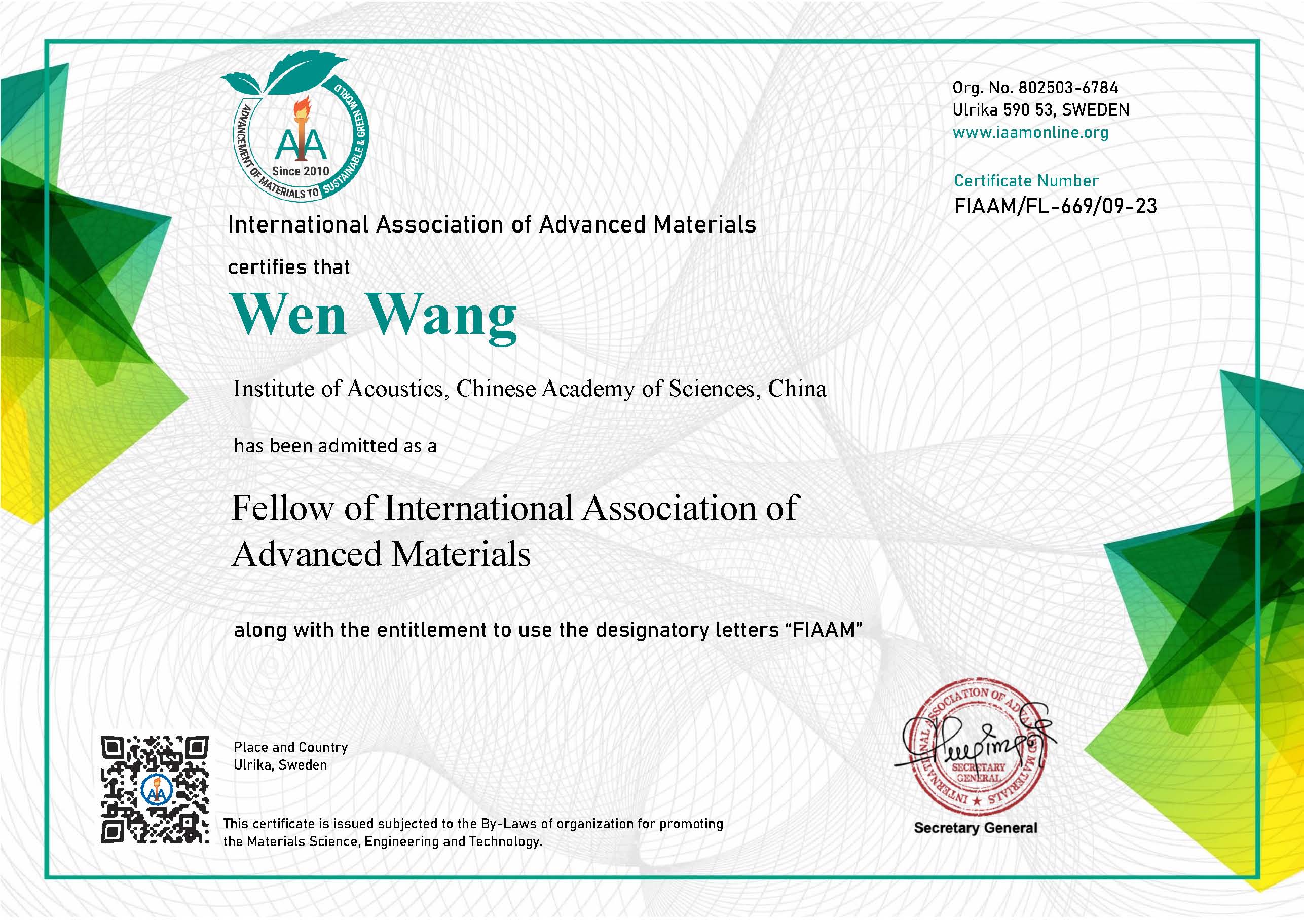近日,获国际先进材料协会(IAAM)通知,超声学实验室王文研究员当选IAAM Fellow,并荣获IAAM科学家奖章,以表彰其在新型传感材料及效应方面做出的突出贡献。