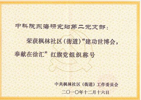 为期184天的上海世博会在各界人民的共同努力下已经圆满闭幕,12月16日上午,上海市枫林街道世博工作总结表彰大会召开,东海站第二党支部被评为枫林社区“建功世博会,奉献在徐汇”红旗党组织,同时我站张万峰、原猛两名党员同志获枫林社区优秀共产党员荣誉称号。