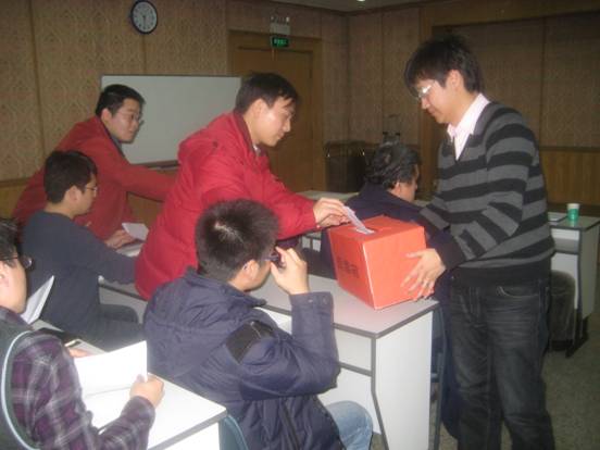 随后,进行了支委换届的活动。新一届支委候选人是多方面考核从支部所有正式党员中选出的六位优秀代表。经过支部全体正式党员(共35人)参与投票,计票等环节,差额选举产生了新一届支委成员的五位成员。