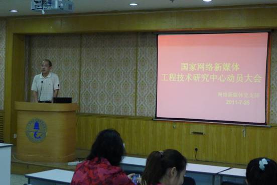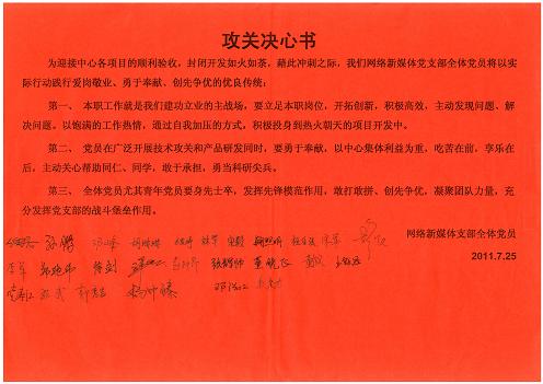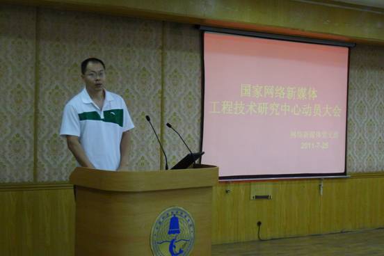 2011年7月25日下午四点,为保证项目顺利验收,激发全体成员的斗志,发挥党支部的战斗堡垒作用,网络新媒体党支部组织的国家网络新媒体工程技术研究中心项目攻关动员大会在DSP多功能厅顺利召开。