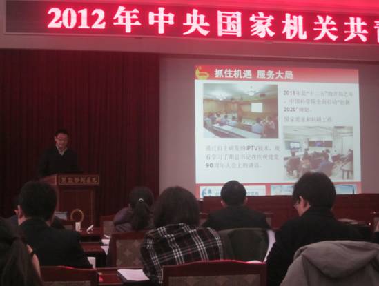 2012年1月5日、6日,在2012年中央国家机关共青团工作会议上,我所网络新媒体团支部作为科学院唯一代表被中央国家机关团工委授予2011年度“中央国家机关最具活力团支部奖”荣誉称号,网络新媒体团支部前任书记、所团委委员杨中臻作为代表进行了事迹汇报。