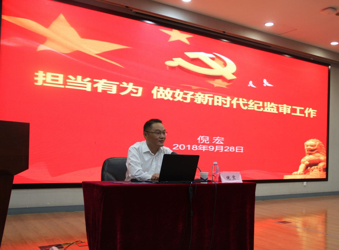 倪宏同志以《担当有为,做好新时代纪监审工作》为题,首先带领大家学习了新修订的《中国共产党纪律处分条例》(以下简称“《条例》”)。他详细讲解了《条例》修订背景和主旨内容,配以生动鲜活的案例,让与会同志们能够更充分准确地理解《条例》的政治性,时代性,针对性。他围绕“新时代、新要求,新形势、新挑战,新担当、新作为”,从分院的角度对纪监审干部提出要求:切实增强政治担当、历史担当、责任担当。希望大家结合科研实际以铁的纪律推动全面从严治党向纵深发展。