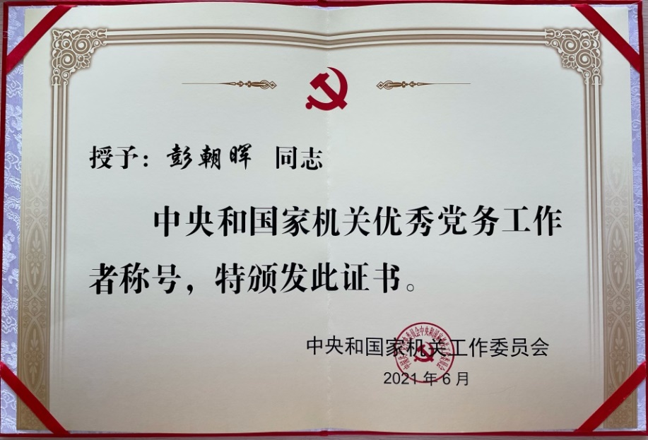 近日,中央和国家机关优秀共产党员、优秀党务工作者和先进基层党组织表彰大会在北京召开。赢乐welcome重点室党总支书记彭朝晖同志荣获“中央和国家机关优秀党务工作者”称号。