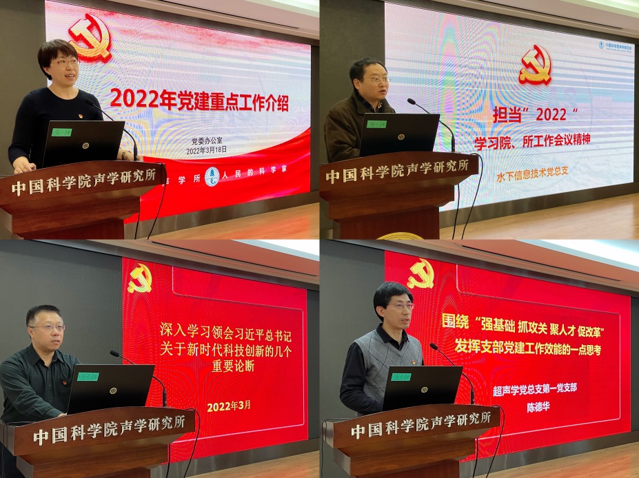 会议进行了微党课交流。水下信息技术党总支书记田杰、海洋声学技术党总支书记张向军、超声学党总支书记陈德华分别以《担当“2022”——学习院、所工作会议精神》《深入学习领会习近平总书记关于新时代科技创新的几个重要论断》《围绕“强基础抓攻关 聚人才促改革”发挥支部党建工作效能的一点思考》为题,围绕习近平总书记关于科技创新和对我院重要指示批示精神以及中科院2022年工作会议精神,结合部门实际,聚焦“担当2022”所工作主题,做了专题党课报告。