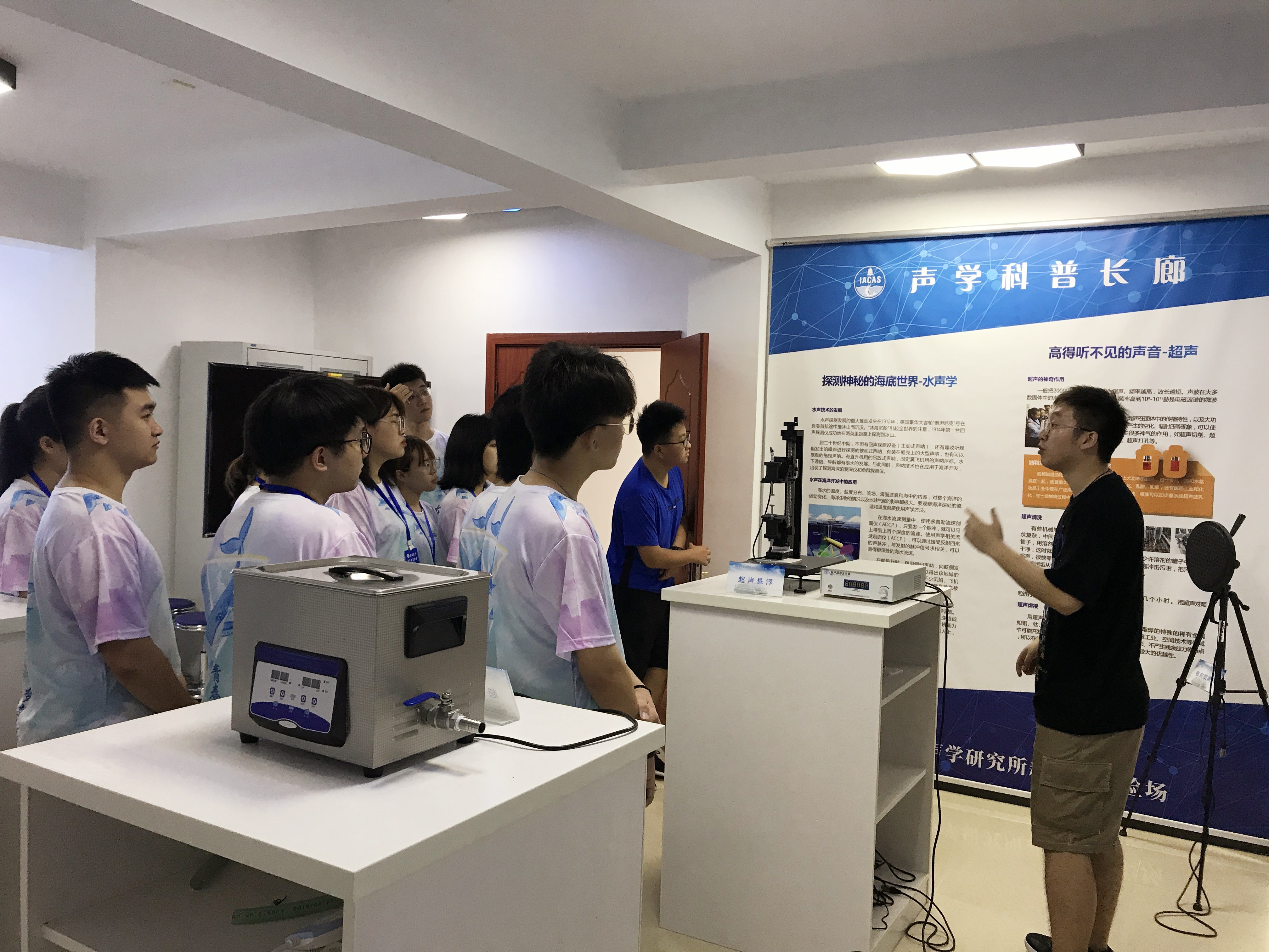 7月28日,营员们开启科普研学、红色教育之旅。营员们首先来到新安江实验场声学科普考察实践基地,聆听东海站陈友元副研究员的《现代数字助听器为听障人士带来新声》科普讲座,以及高级实验师刘月明讲述新安江实验场发展历程;进入声学实验互动区,通过体验式观察超声雾化、超声乳化、超声清洗、超声悬浮等超声科普教具,了解超声在生活中的应用,参观海陆空一体化立体图直观了解水声知识。营员们还登上实验叁号科研船内参观。