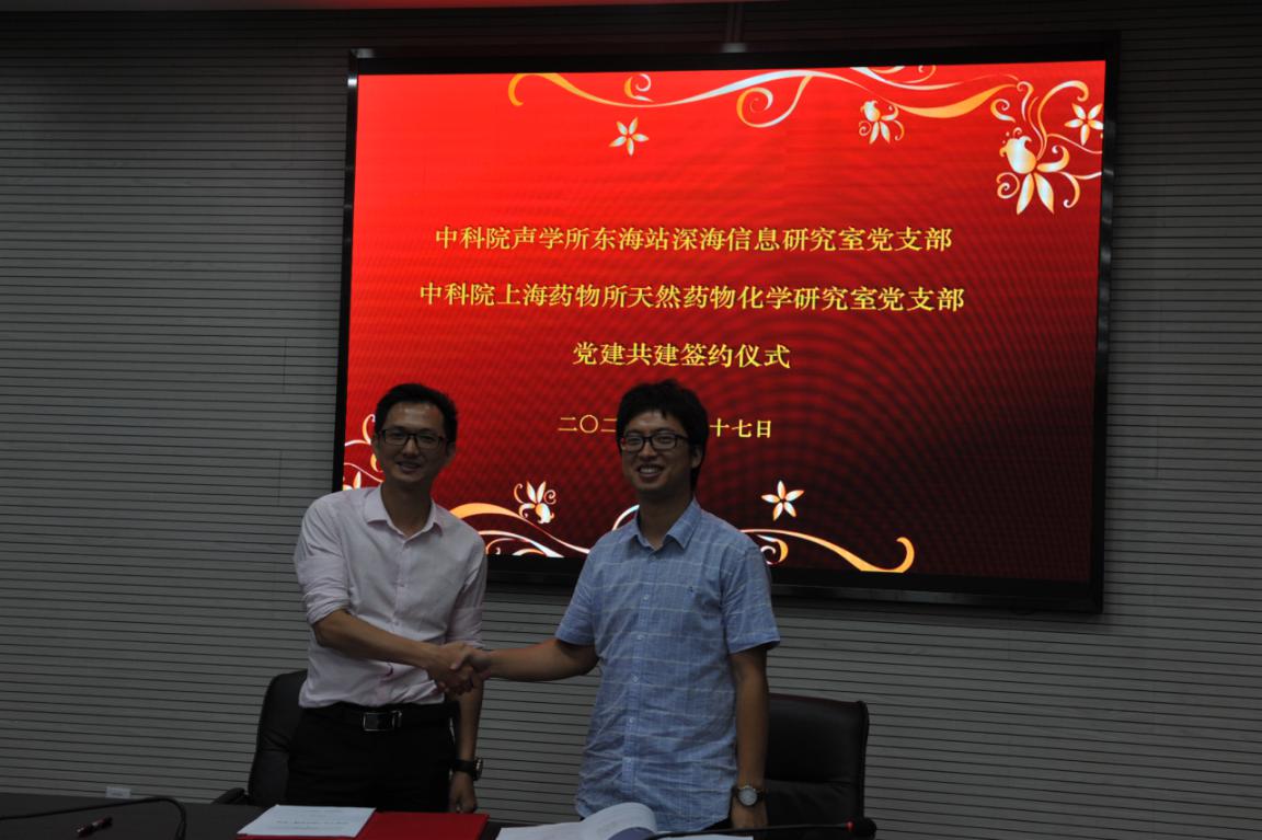 为了进一步落实加强基层组织党建工作,深化“不忘初心、牢记使命”主题教育活动,充实支部建在实验室实践活动内容,2020年8月17日下午,东海研究站深海信息研究室党支部与中科院上海药物研究所(以下简称药物所)天然药物化学党支部举办了结对共建仪式。东海站党委书记张伟才,上海药物所工会副主席、党政办副主任方婷出席本次共建活动。共建活动由深海信息研究室党支部书记洪峰主持。