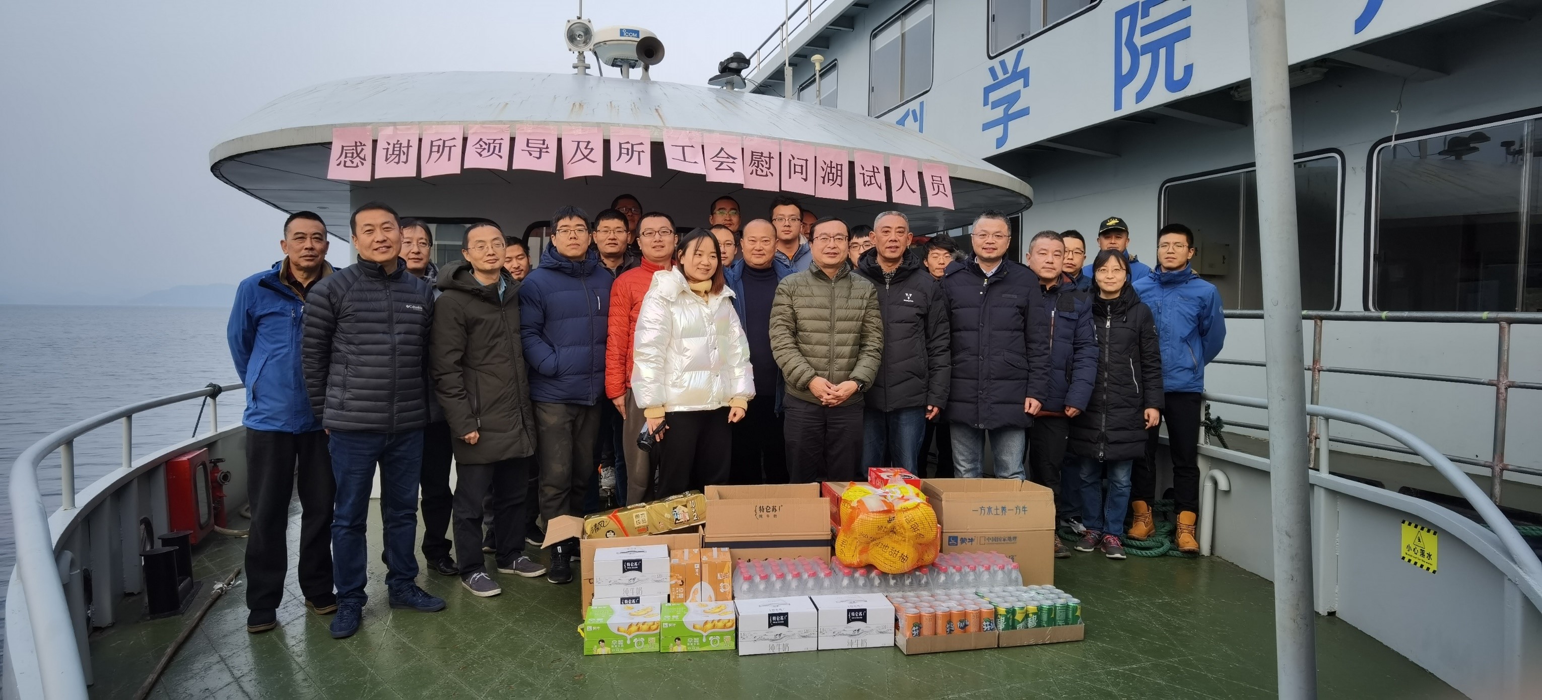 湖试团队经历了春夏秋冬:夏季甲板温度高达75℃,团队人员汗水湿透衣物;秋季连日降水,团队人员身披雨衣调试设备;冬季阴冷潮湿,团队人员抵御寒冷测量数据。这个团队经历了日夜连轴、不分工作日和休息日的辛勤工作,白天调试搭建实验平台,分析处理数据,夜晚从凌晨一点开始实验,测量至凌晨五点太阳升起。这个团队也经历了艰苦环境,团队人员长期工作和生活在实验基地,远离县城中心,很少上岸活动和采购生活物资。实验团队在恶劣环境和高强度工作条件下,大家团结一致,磨炼出一支具有丰富湖试经验的队伍,有信心圆满完成实验任务,不忘初心,再创辉煌!