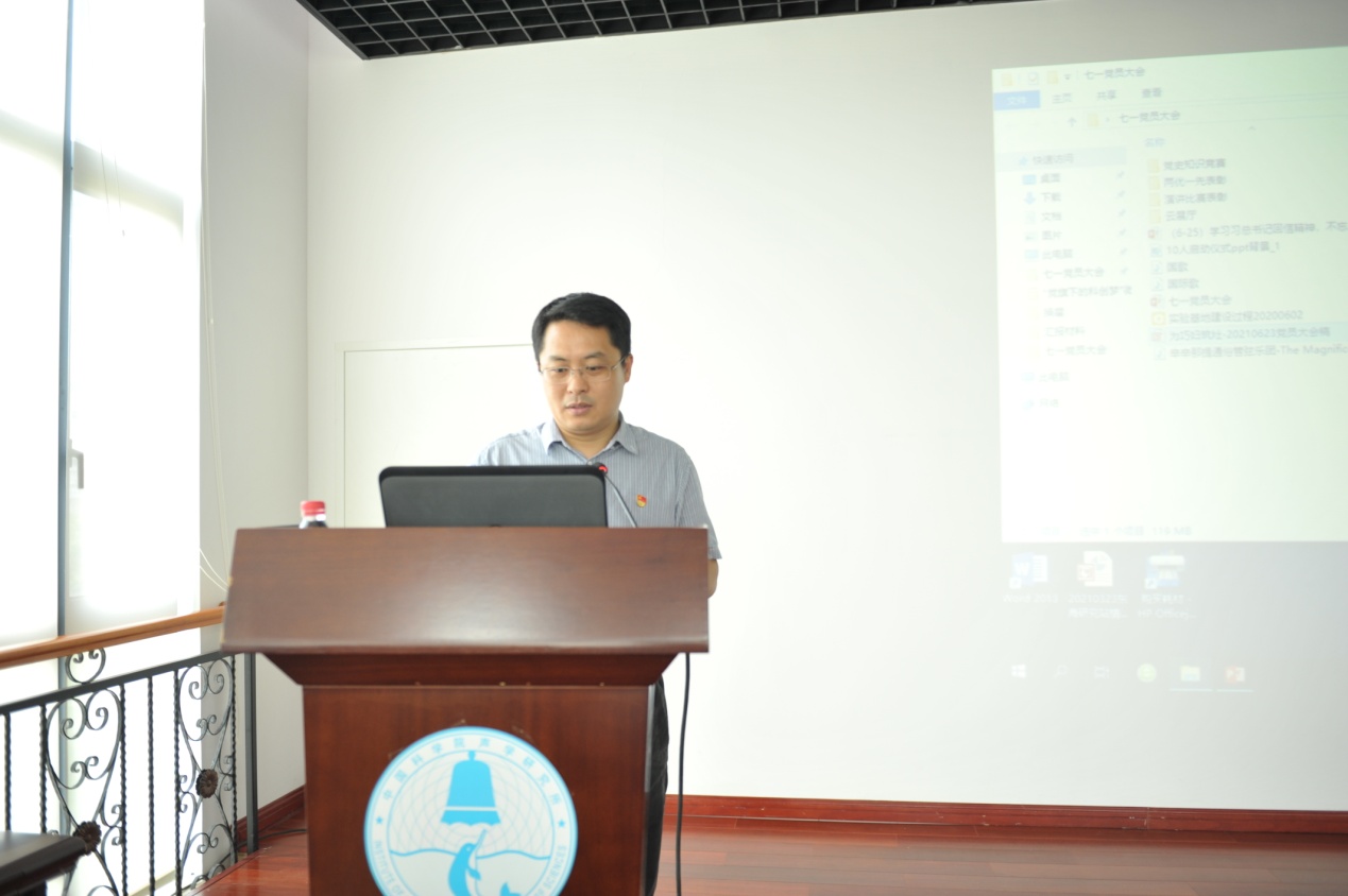 建党100周年之际,2021年6月25日,东海研究站召开庆祝建党100周年党员表彰大会暨党史学习教育专题党课报告会。大会由党委副书记、纪委书记丁培主持。