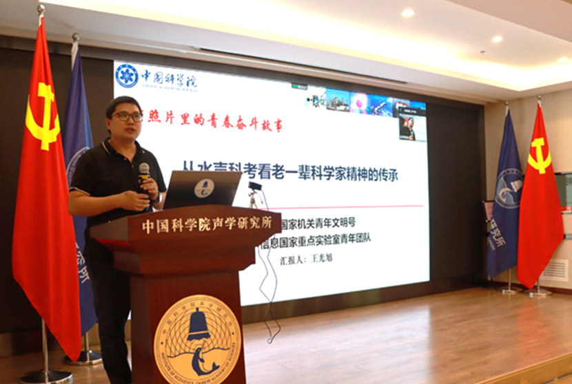 王光旭以《从水声科考看老一辈科学家精神的传承》为题分享了“中央和国家机关青年文明号”的接续奋斗故事。他用一张张珍贵的老照片,讲述着上世纪五六十年代以来,我国水声科考的筚路蓝缕,及张仁和院士等老一辈科学家,为报效祖国而披荆斩棘坚持开展深远海试验的感人画面,为我们创造了宝贵的精神财富。他引用青年同志们迎难而上、坚忍不拔,敢担当、有作为的系列感动瞬间,强调正是怀揣这份精神财富,传承老一辈科学家精神,才让青年一代真正扛起了为国奉献、创新发展的责任和担当。