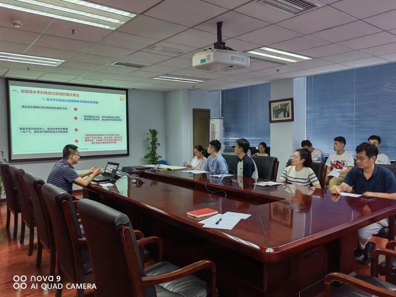 徐及带领与会人员专题学习习近平总书记《论科技自立自强》,从实现高水平科技自立自强的重大意义、理解高水平科技自立自强的深刻内涵、推动高水平科技自立自强的战略举措三个方面向大家阐述了科技自立自强的重要性和迫切性,并结合实验室的实际科研工作,讲述了语音领域实现科技自立自强的历程。