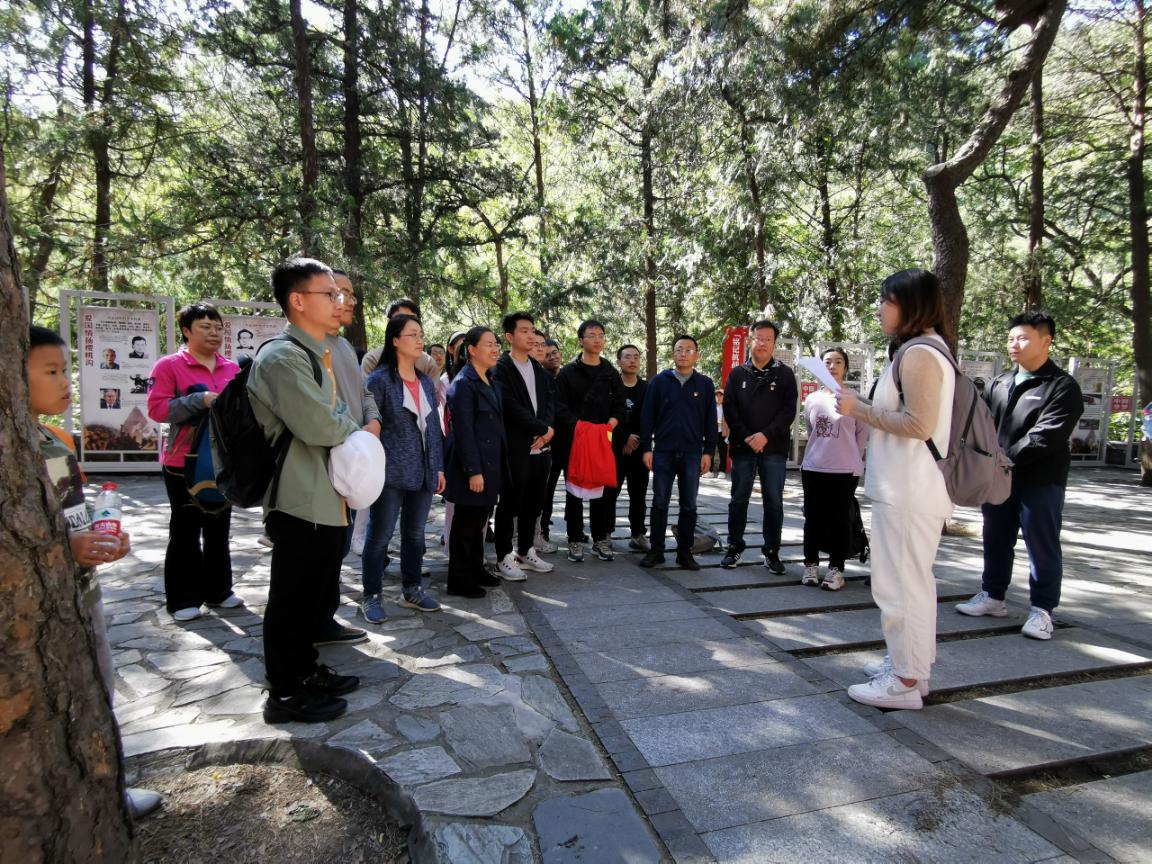 “一二 九”运动纪念地位于北京植物园樱桃沟最深处,这里是北平学联和民先队在“一二 九”运动时期联合举办夏令营,利用多种形式团结教育青年的地方。在活动现场,大家参观了“一二 九”运动纪念亭、刻有“保卫华北”字迹的大青石、革命英雄事迹纪念栏,以及“与历史对话”、“不平静的书桌”等系列雕塑作品。学生党员余卿为大家进行讲解,共同学习回顾了党领导人民群众发动“一二 九”抗日救亡运动、众志成城抵抗侵略的英勇事迹。