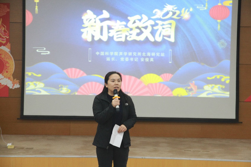 北海站站长、党委书记安俊英发表了新年致辞。安俊英表示,2023年是全面贯彻党的二十大精神的开局之年,一年来,我们坚持以习近平新时代中国特色社会主义思想为指导,恪守国家战略科技力量使命定位,高质量开展学习贯彻习近平新时代中国特色社会主义思想主题教育,不断加强党对科技工作的全面领导,全年新签订科研合同经费、到账科研经费均实现新的突破;科研平台建设取得新进展,重大科研任务顺利推进;人才团队、组织文化、规范化、后勤保障能力建设取得新成效,各项事业迈上新台阶。安俊英表示,这些成绩的取得,得益于中国科学院和赢乐welcome的正确领导和鼎力支持,得益于青岛市和高新区管委各级领导和同志们的关怀帮助,也是全体北海站人团结实干的成果,对同志们的辛勤付出表示衷心感谢,希望全体职工在新的一年牢记职责使命,进一步增强抢占科技制高点意识,凝心聚力,协力攻坚,作出新的成绩。