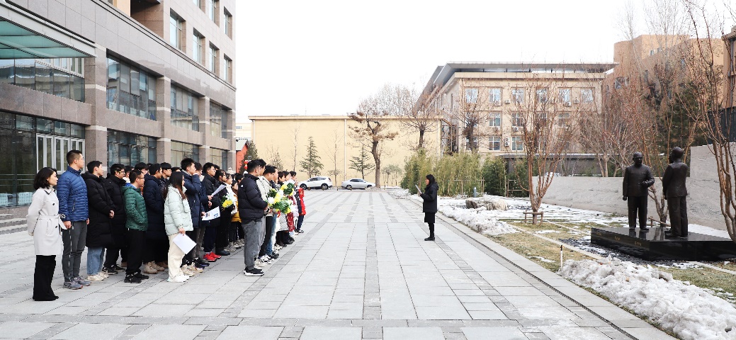 党支部书记郝程鹏和四名青年学生向院士塑像献花,深切怀念他们对声学事业发展作出的突出贡献。