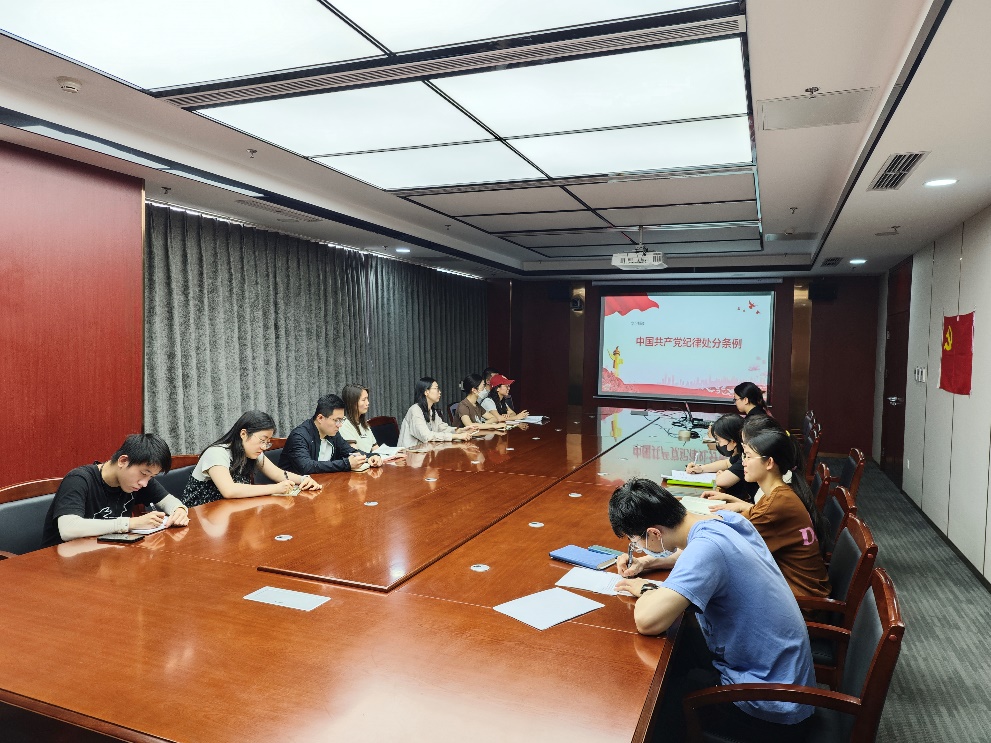 陆艳艳带领大家集体学习《条例》,详细介绍《条例》的主旨要义、解读修订亮点,表示要以严明的纪律推进党的自我革命,每一位党员同志需要从思想上固本培元、弘扬党的光荣传统与优良作风,把增强党性、严守纪律、砥砺作风融入日常的生活、科研以及工作当中,坚决坚守党的纪律红线。