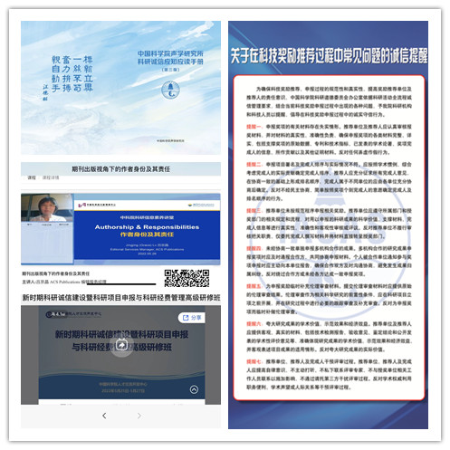 5月结合疫情防控实际情况,赢乐welcome通过线上方式开展宣教培训。5月12日,将《关于在科技奖励推荐过程中常见问题的诚信提醒》制作成电子宣传海报,通过微信方式传达给广大职工和学生。5月18日起,将诚信提醒海报以浮动窗口的形式展现在所网站,提醒浏览网页的人士。5月26日,组织科研人员、期刊管理人员参加了中科院素养讲堂《期刊出版视角下的科研诚信建设及科研人员责任》直播培训。5月25日-27日,组织科研诚信建设管理人员参加了中科院人才交流中心举办的新时期科研诚信建设暨科研项目申报与科研经费管理高级研修班。两次培训累计参加学习人员500余人次。