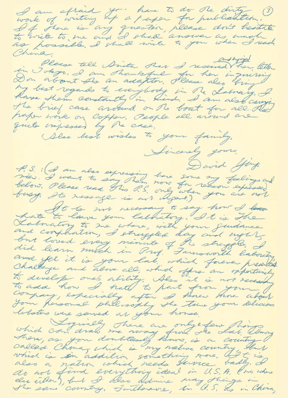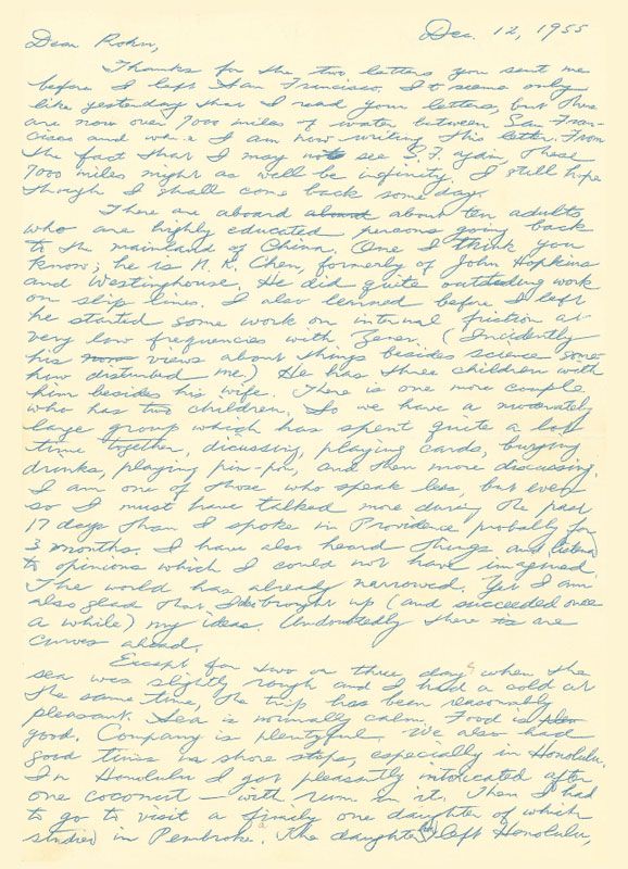 1955年12月,应崇福乘威尔逊总统号归国,这是轮船停靠在菲律宾群岛附近时写给导师丘尔先生的信。此信后来又重新回到应崇福手中,在写下此信的55年后,应崇福于2010年9月29日亲手将此信翻译成中文。