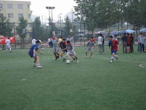 5月21日下午,“所庆杯”足球比赛的决赛如期在中关村体育场举行。虽然比赛前天空下起了雨,但是这点小雨一点也没有浇灭广大师生关注“所庆杯”决赛的热情。赛前就有大批的啦啦队到达比赛场地,现场的工作人员还很细心地为大家支起了挡雨的帐篷。