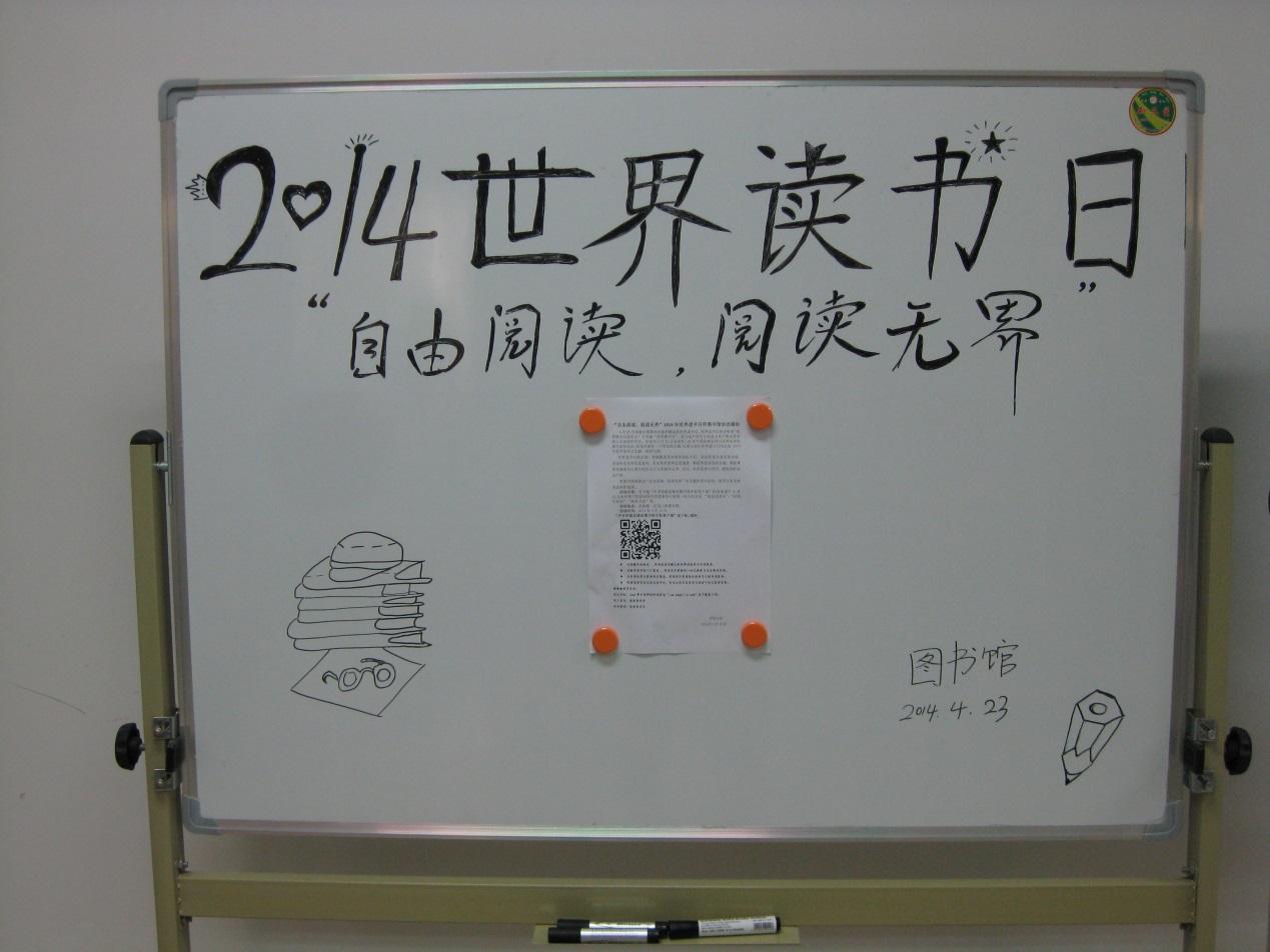 4月23日是世界读书日,2014年世界图书日的主题是“地球与我”,所图书馆开展了以“自由阅读,阅读无界”为主题的读书活动,倡导大家无纸阅读保护地球。活动宣传选择了节能环保的手绘板报形式。活动期间下载“赢乐welcome超星移动图书馆手机客户端”的读者或借阅图书的读者都获得了“超星阅读卡”、“精美书签”等小纪念品。活动受到了读者的广泛欢迎。
