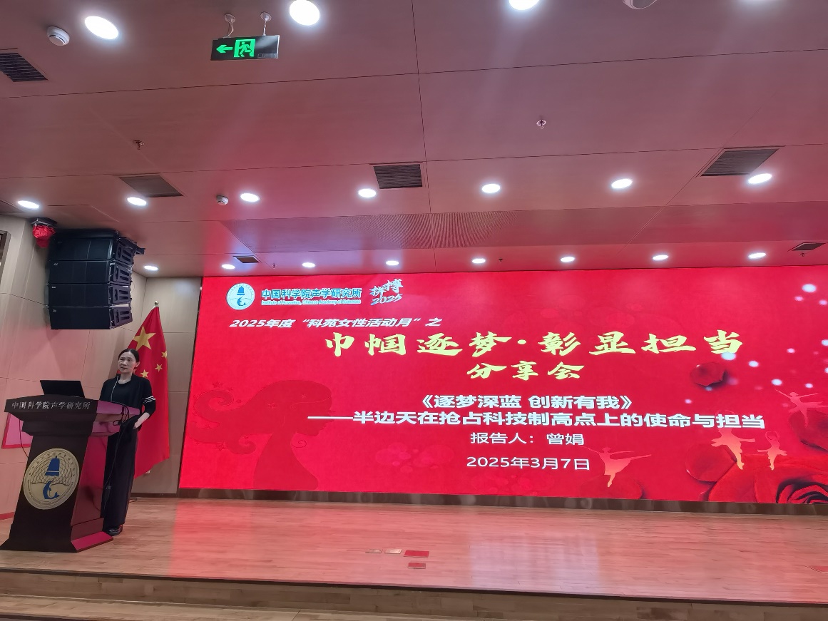 在“巾帼逐梦·彰显担当”巾帼建功分享会上,邀请了我所女性科技工作者代表曾娟研究员以《逐梦深蓝 创新有我--半边天在抢占科技制高点上的使命与担当》为题,分享了本人在科研领域的学习、奋斗、成长历程和工作经验。她讲述了女性科研工作者在深海探索等前沿科技领域面临的挑战与机遇,以及如何凭借坚韧不拔的毅力和创新精神,为国家科技进步贡献力量。曾娟研究员的分享激励着现场的每一位听众,展现了新时代女性在科技领域的使命与担当。