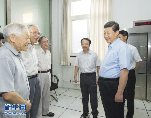 7月17日,中共中央总书记、国家主席、中央军委主席习近平到中国科学院考察工作。这是习近平同当年参与北京正负电子对撞机建设和应用的3位院士交谈。新华社记者 李学仁 摄