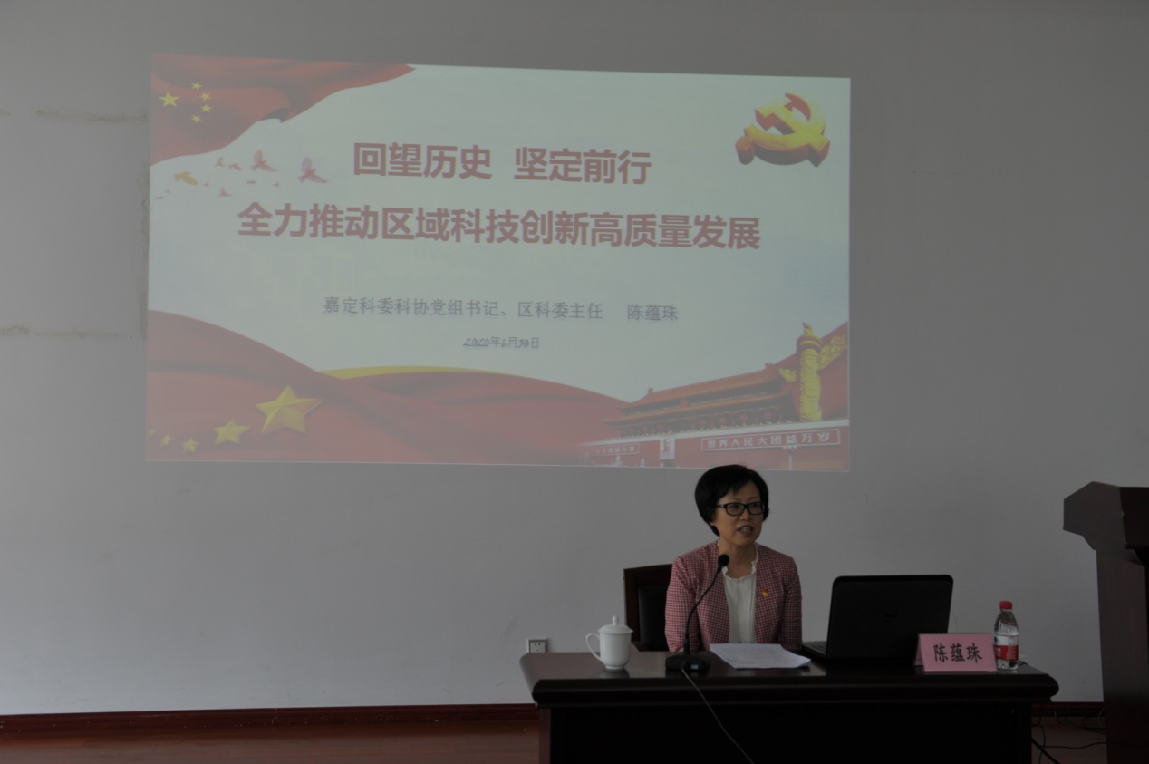 嘉定区科委科协党组书记、区科委主任陈蕴珠作了题为《回望历史坚定前行全力推动区域科技创新高质量发展》的专题报告。她分享了“四史”学习的心得体会:社会主义道路是历史的选择、人民的选择;落后就要挨打,发展才是硬道理;科技兴国七十载,砥砺初心正其时。她从人民城市、国家战略和全市部署、贯彻新发展理念、创新引领四个角度出发,鼓励大家要勇攀高峰,为上海科创中心建设贡献自己的力量。