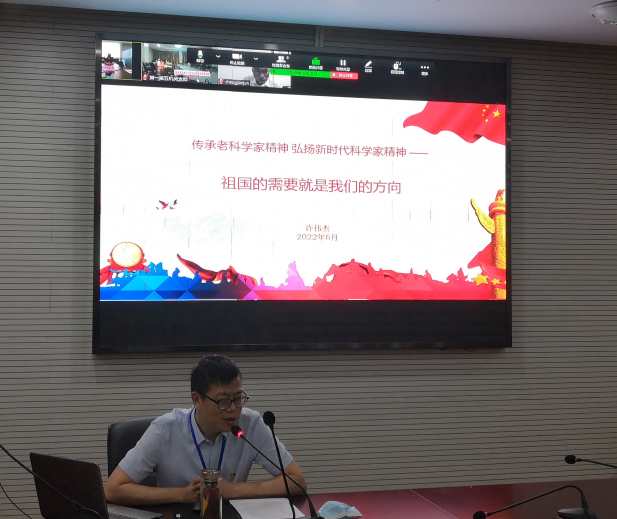 许伟杰站长以《传承老科学家精神 弘扬新时代科学家精神——祖国的需要就是我们的方向》为题作主题报告。报告深刻解读了科学家精神中的爱国奉献精神,从龚祖同、黄耀曾、王守武、汪德昭等院士的入党志愿书以及他们的感人事迹中,大家感受到了老一辈党员科学家们积极响应党的号召,笃定初心、勇担使命,为党和人民事业无私奉献的家国情怀和崇高精神。新时代需要继承发扬以国家民族命运为己任的爱国主义精神,更需要继续发扬以爱国主义为底色的科学家精神。许伟杰号召全站科研人员要传承践行科学家精神,始终把国家的需要放在第一位,面向国家重大需求,聚焦主责主业,准确把握党中央、国务院对科技创新和中科院工作的新要求新部署,为真正成为国家战略科技力量主力军作出贡献。