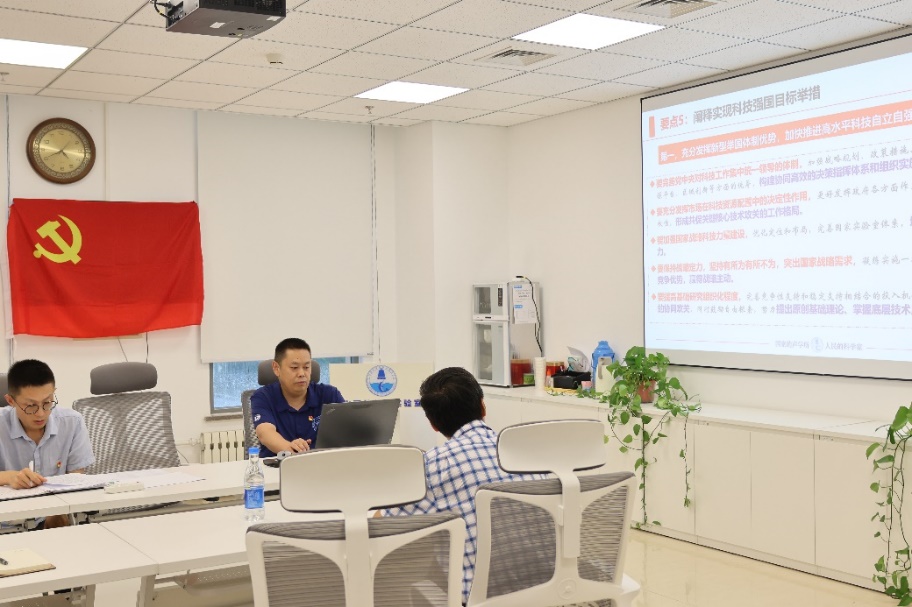 总支书记郝程鹏为与会党员讲授专题党课,带领大家集中学习贯彻习近平总书记在全国科技大会、国家科学技术奖励大会、两院院士大会上的重要讲话精神,重点围绕新时代科技事业积累的“八个坚持”重要经验、“两个进一步”、建成科技强国必须具备的“五个强大”要素、实现科技强国的目标举措以及习近平总书记对两院院士和广大科技工作者提出的希望等方面进行深入细致的解读。结合实验室当前的工作实际,郝程鹏谈到,国家对于科技创新工作的高度重视,给予了科技工作者施展才华的广阔舞台,大家要不负使命担当、敢于攻坚克难,面向国家重大需求和科技前沿,积极探索、团结协作,在关键核心技术上取得突破,把各项任务完成好。