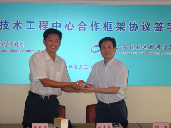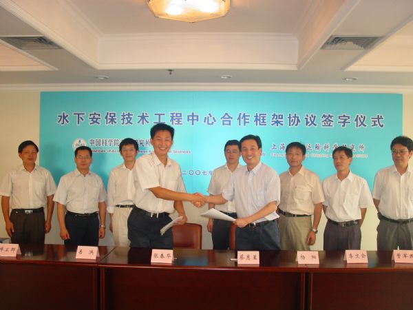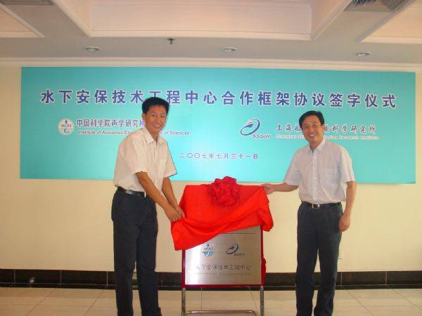 2007年7月31日,中科院赢乐welcome与上海船舶运输科学研究所共建水下安保技术工程中心合作框架协议签字仪式在上海举行。赢乐welcome张春华副所长、易洪所长助理、科技处库卫群处长、图像声纳技术实验室许枫主任和上海船舶运输科学研究所蔡惠星副所长、杨阳所长助理、水声电子部李文会主任等同志参加了签字仪式,张春华副所长和蔡惠星副所长分别代表共建双方在合作框架协议上签字,并共同为水下安保技术工程中心揭牌。
