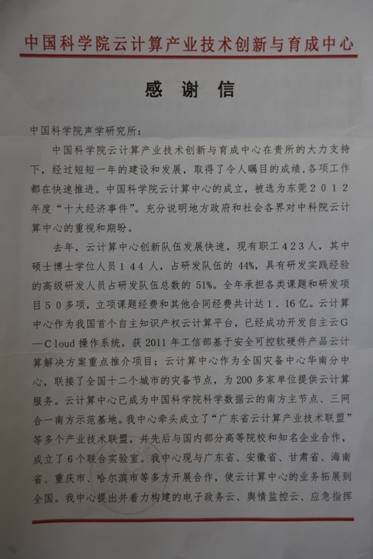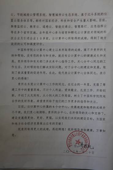 东莞中国科学院云计算产业技术创新与育成分中心致我所感谢信