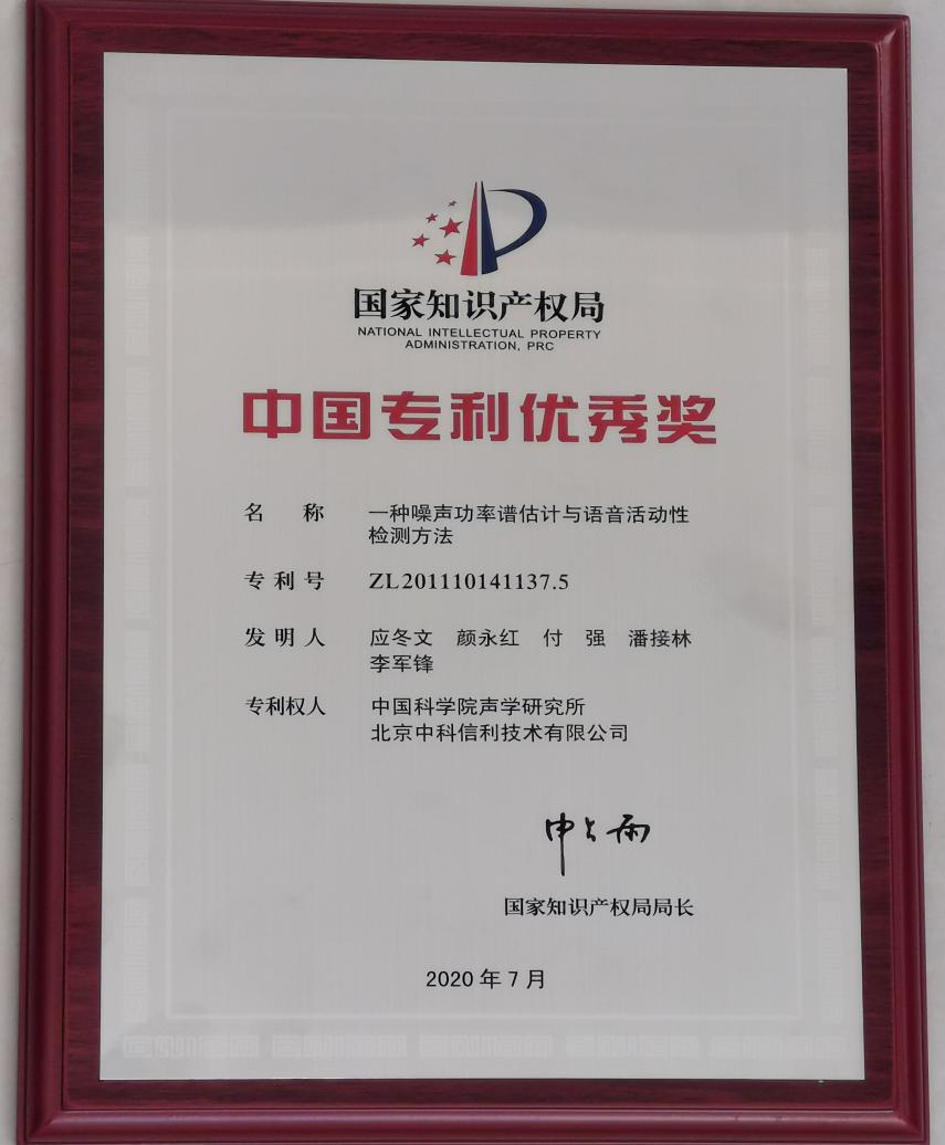 “一种噪声功率谱估计与语音活动性检测方法”获第二十一届中国专利优秀奖