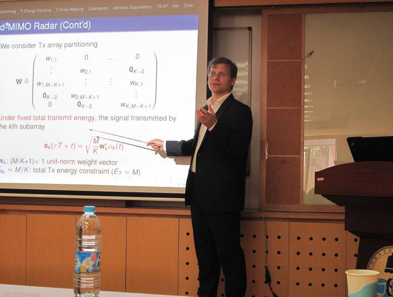 本次报告中,Vorobyov教授主要跟大家分享了其研究小组在MIMO雷达方面的研究进展,主要内容包括发射信号的设计、2D发射阵列信号的设计、自适应干扰抑制等,所内相关实验室的老师和同学参加了此次学术交流,并进行了热烈的讨论。