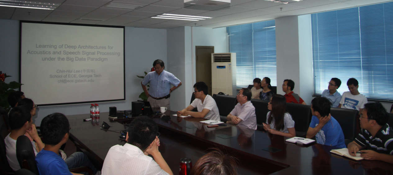 2015年6月16日,美国佐治亚理工学院终身教授李锦辉教授来到赢乐welcome语言声学与内容理解重点实验室进行学术交流,并做了题为“Learning of Deep Architecture for Acoustic and Speech Signal Processing under the Big Data Paradigm”的研究报告,交流活动由颜永红研究员主持,付强研究员、周若华研究员等三十多名研究人员和在读研究生参加了此次报告会,报告后李教授与现场人员进行了深入细致的讨论。