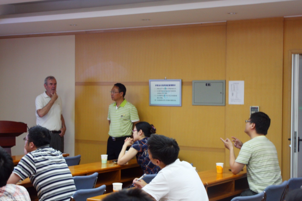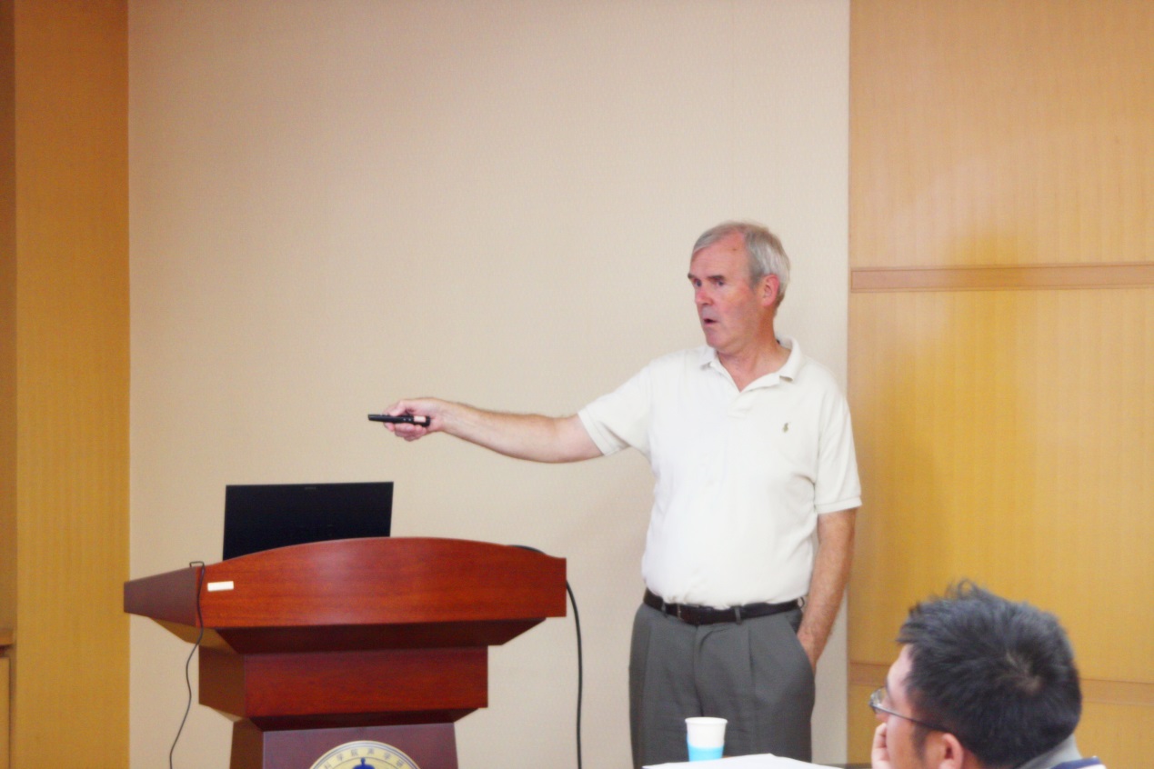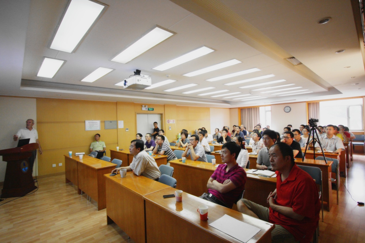 Norris教授首先向与会师生简单介绍了其任教的美国罗格斯大学。随后,他对谐振振荡器超材料、低频带隙超材料、负折射率声子晶体等声学超材料的特性进行了生动的概述。在此基础之上,Norris教授从实验特性、数值模拟、应用前景等方面对负折射率声学超材料进行了深入而详细的介绍。报告引起了与会者的广泛兴趣,报告结束后,王秀明研究员、杨军研究员、高永康研究员、毕亚峰、陆文佳等多名师生就报告内容与Norris教授进行了深入的交流,自由讨论进一步加深了对该问题的理解和思考。王秀明研究员与何晓副研究员还针对声学超材料应用于随钻声波测井方面的可能性与Norris教授进行了前瞻性的讨论。