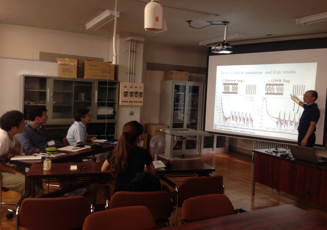本次访问过程中,赢乐welcome研究人员与山梨大学、东京大学研究人员还分别作了深入地学术交流报告。李红浪研究员讲解了研究课题组的发展、研究内容及发展方向,包括声表面波传感器、声表面波谐振器、射频识别标签技术及声子晶体等;田亚会博士生就声子晶体方面的研究作了详细报告,包括其背景、研究内容及未来工作;蔡飞达博士生详细讲解了声表面波传感器系统各部分的功能及设计方案。山梨大学Shoji Kakio教授就其关于基于声表面波驱动的声光调制光波导器件的研究作了详细报告;Yu Sugaya硕士生作了关于Ta2O5薄膜的压电特性及铁电特性的研究报告;Masashi Gomi硕士生作了关于减小漏纵波损耗的研究报告。东京大学Takeshi Morita教授就其谐振型驱动器研究作了精彩的报告。通过学术交流报告,中日双方研究单位彼此表现出浓厚的兴趣,分别就进一步的研究合作做了深入探讨。