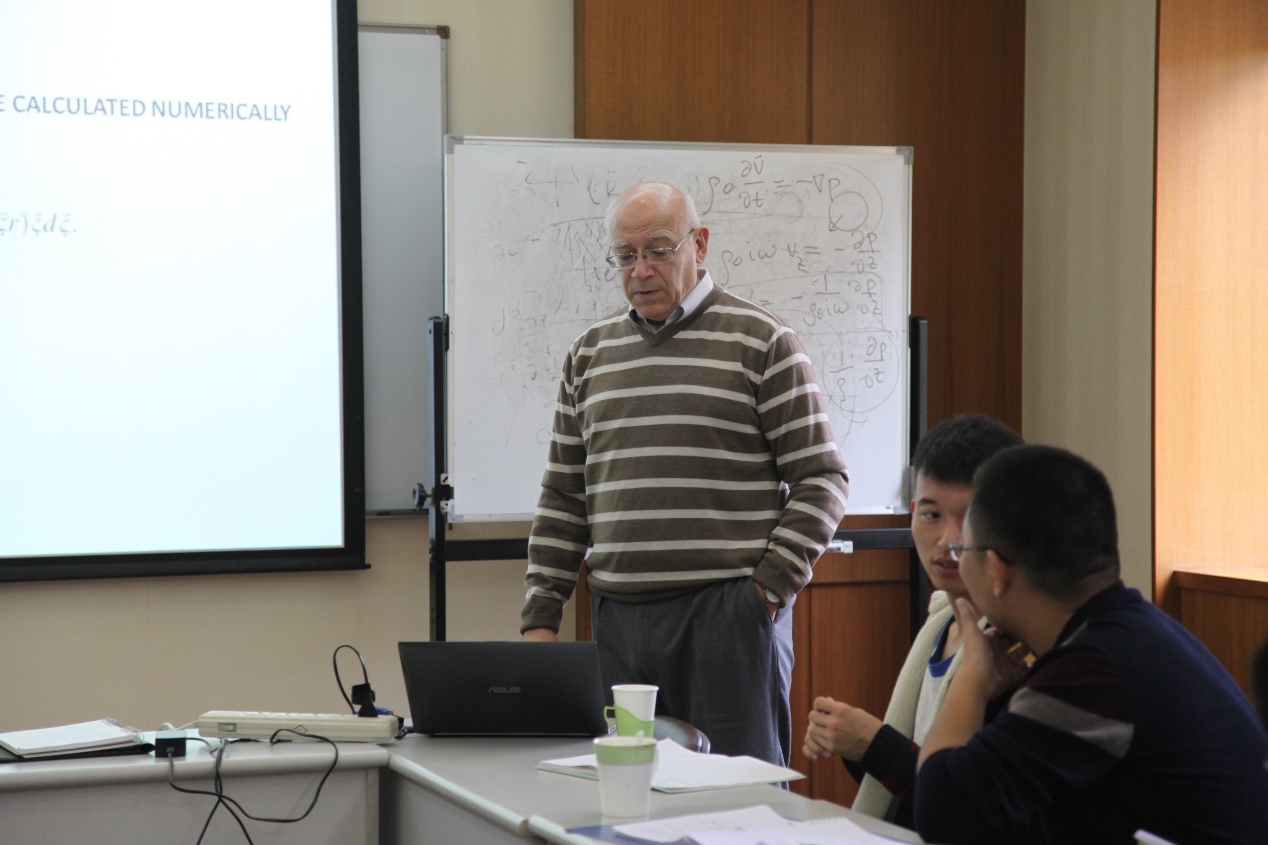同时,Boris Katsnelson 教授给研究生开设了关于《Shallow water acoustics》的系列课程讲座,四天的讲座内容包括《Sound field of the point source in a layered waveguide》、《Noise in shallow water》、《Sound field in shallow water waveguide with random inhomogeneities》和《Horizontal refraction in shallow water》。Boris Katsnelson 教授耐心细致的为研究生们讲解了分层介质中的点源声场、浅海噪声、随机非均匀介质中的声场和声传播水平折射等基础理论知识。