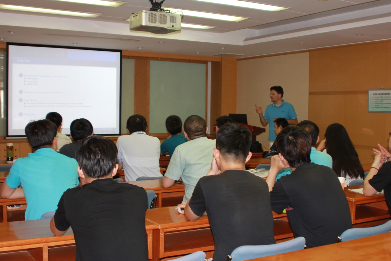 Danilo Orlando副教授首先从统计信号处理方法所关注的几大问题引入主题,阐述了不变理论在雷达检测中的应用。详细介绍了检测中的充分性、不变性和最大能量不变一致性检测(UMP Test),并给出了该模型在均匀背景和非均匀背景下符合恒虚警性能的结论。Danilo Orlando副教授的报告深入浅出,内容丰富精彩,引发了参会师生的共鸣。会后Danilo Orlando副教授与郝程鹏研究员及科技发展部相关同志就未来国际合作开展了积极的讨论与交流。