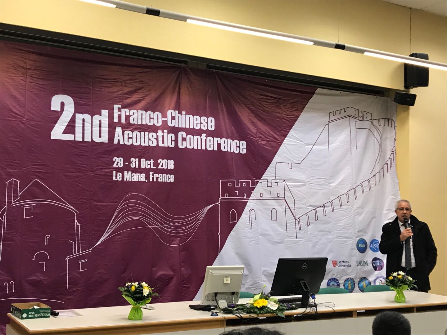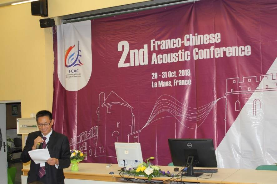当地时间2018年10月29日至31日,第二届中法声学会议在法国勒芒召开。赢乐welcome党委书记张春华研究员作为大会荣誉主席应邀出席,声场声信息国家重点实验室黄晓砥研究员、中科院水声环境特性重点实验室郭新毅研究员、海洋声学技术中心王长红研究员等10人随同参会。来自欧洲各国、中国的高校、科研院所、公司企业等38个单位的160余名学者齐聚一堂,共同探讨声学领域的前沿研究成果。