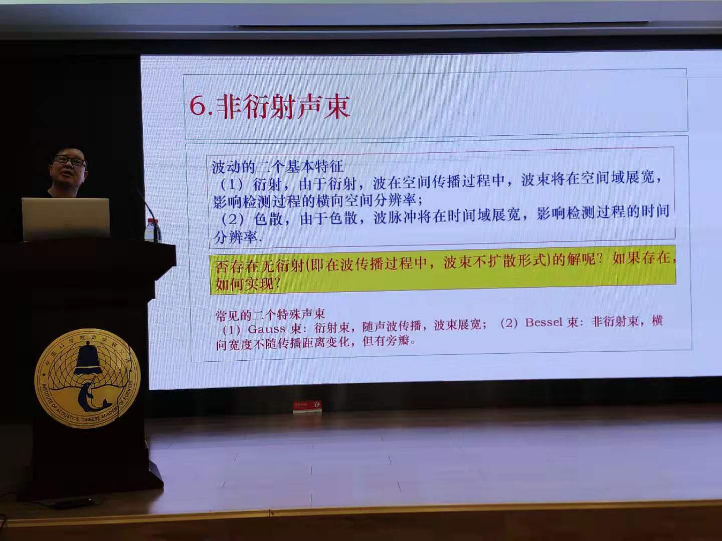 凭借扎实的理论功底,程建春老师简明扼要地讲解了点源、高斯声束、圆锥区域问题中的球函数表示和应用,以及柱坐标系中点源、螺旋波模式和非衍射声束等问题。程老师深入浅出地从特殊声场的球函数、柱函数展开表示开始推导,引出螺旋波模式并介绍了声涡旋相关的前沿工作与问题;随后又对非衍射声束和声场声源耦合的相关研究内容进行了介绍。讲座中程老师阐述了理论研究与实际应用的关系,指出虽然单凭理论推导无法解决工程问题,但工程问题终究还是需要从基础理论出发。