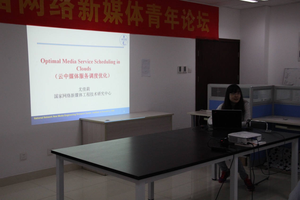 本届论坛围绕网络新媒体的关键科学问题和核心技术展开热烈的讨论,共有包括副研究员、青年教师、优秀研究生在内的12名青年学者做了学术报告。报告内容主要集中在未来网络、大数据、网络测量等互联网前沿技术。其中,何化钧介绍了未来网综合测量系统的设计与实现,为未来网络中的测量提供一种新颖的思路;尤佳莉介绍了云中媒体服务调度优化,根据流媒体任务的特点,提出了一种分层调度的算法;卓煜介绍了在线视频服务QoS测量系统的研究,介绍了现有测量系统的缺点,并提出了改进方法,同时对测量得到的结果进行了分析。会议现场大家踊跃提问,深入交流,气氛热烈。