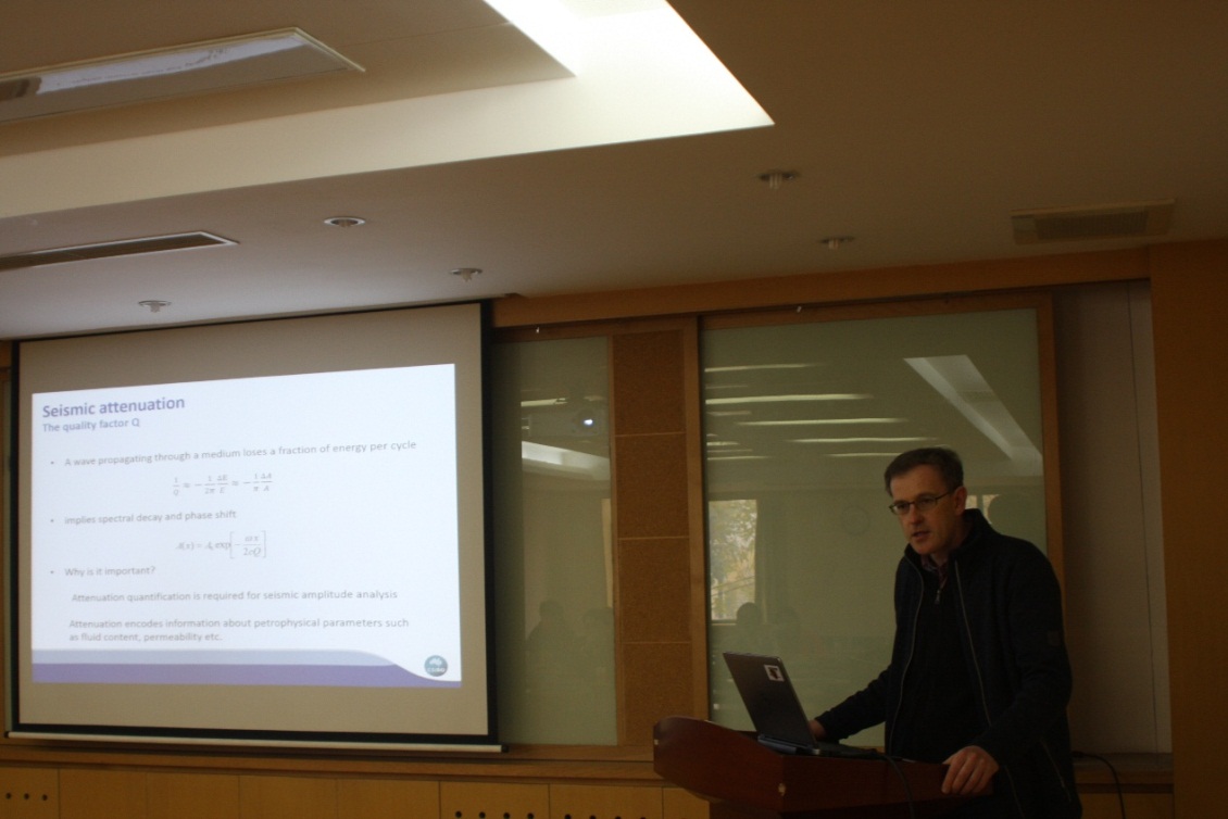 Tobias Muller博士首先由地震衰减质量因子Q引入主题,阐述了衰减在地球物理勘探中的重要性,详细介绍了从地震VSP、声波测井全波形、数字岩石物理实验中等不同尺度观察到的衰减现象。他向大家描述了声波测井中散射衰减的发生机理,散射Q值可以通过推广的O’Doherty-Anstey理论模拟,并展示了其在页岩气勘探中的应用效果,对指导声波测井在非常规油气勘探中的应用具有重要意义,最后介绍了一种低频衰减实验室测量方法。Muller博士报告由浅入深,理论联系实际,内容精彩,引起了与会师生的浓厚兴趣,在场人员就报告内容进行了积极的讨论与交流。会后Muller博士还参观了超声技术中心的岩石物理实验室,并就未来双方可能的合作展开了协商。