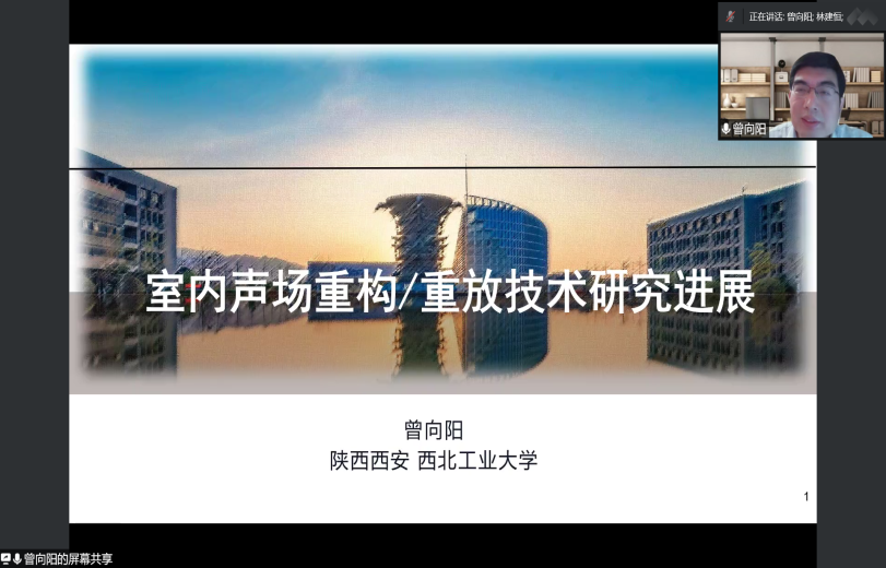 曾向阳教授作题为《室内声场重构/重放技术研究进展》的报告。报告主要介绍基于波动声学建模的室内声场重构方法、基于可变指向性扬声器阵列的室内声场重放技术和3D虚拟声设计等方面的研究进展。