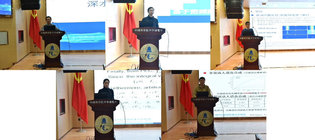 贾晗研究员、柴勇研究员、戚聿波副研究员、周吟秋副研究员和程高峰副研究员分别作题为《基于超材料的宽频高效水-气跨介质声通信》《深水换能器研究进展》《基于深海矢量垂直阵的目标三维被动定位》《多相孔隙及压电介质的声场表述新思路》《基于半监督学习的语音识别技术研究》的学术报告,展示了实验室本年度取得的代表性研究成果。学术秘书胡承昊助理研究员汇报了实验室开放课题的申请与执行情况。
