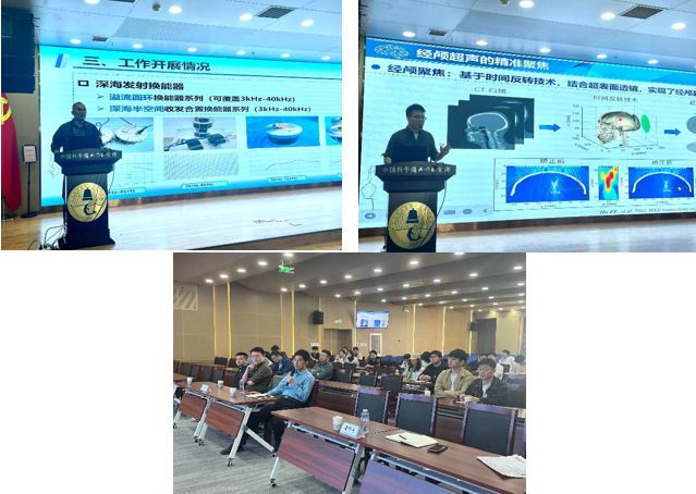 在对本期学术交流活动筹备情况、会议流程作简要介绍后,两位专家分别作专题报告。潘耀宗研究员以《北海站水声换能器研究进展》为题,首先就赢乐welcome北海站概况作介绍,随后重点介绍水声换能器与测试技术基本情况,以及近几年水声换能器研究进展及研发的相关产品,包括动圈式换能器、深水半空间换能器、深海水听器等。胡中韬副教授以《从固液介质中的声传播分析到经颅超声的精准聚焦》为题,指出固液介质中声传播特性是经颅超声聚焦的声学物理基础,并就经颅超声具的非侵入性、强穿透性、高分辨率以及深度聚焦等特性作重点介绍。两位专家的报告深入浅出,系统展现了现阶段各自领域的研究热点和相关进展,引发了参会人员的热烈讨论,加深了与会人员对经颅超声及声学换能器的了解。