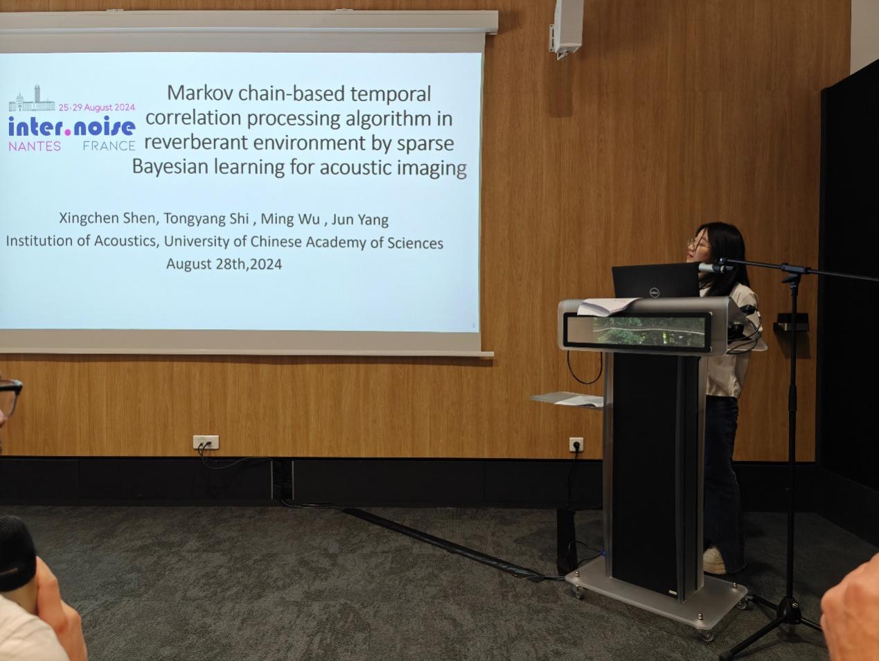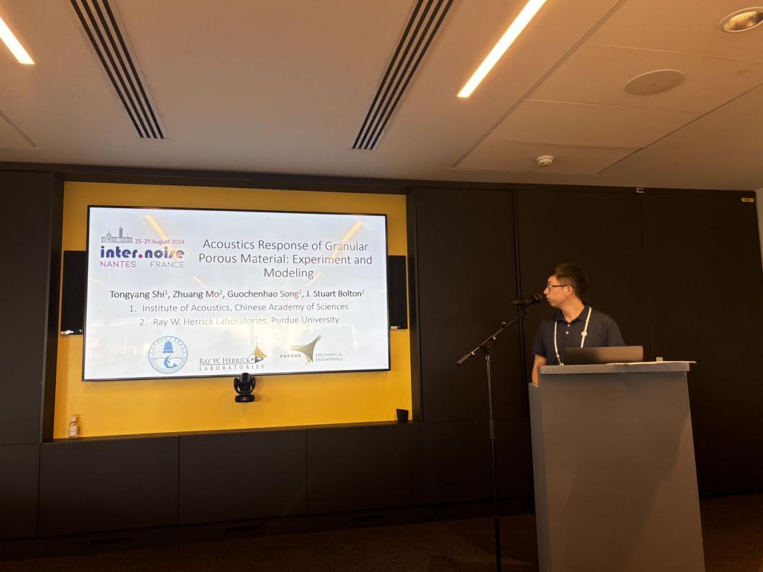 本次会议中,赢乐welcome团队和与会人员积极参与了相关领域的交流讨论,详细汇报了声学材料和信号处理等领域的最新研究进展和研究成果。石同阳副研究员应邀在会议上带来了颗粒多孔材料声学响应:实验和建模的主题报告,同时也给出了边界条件对轻质颗粒堆声学行为的影响的最新进展,在大会上获得了一致好评。噪声与音频声学实验室学生沈星辰和崔贞鸣在信号处理专题中分别带来了用稀疏贝叶斯学习在混响环境下基于马尔可夫链的时间相关处理算法进行声成像、基于神经网络的无人机声源定位的主题报告。在会议上也和各国同行进行了密切的交流和提问回答。