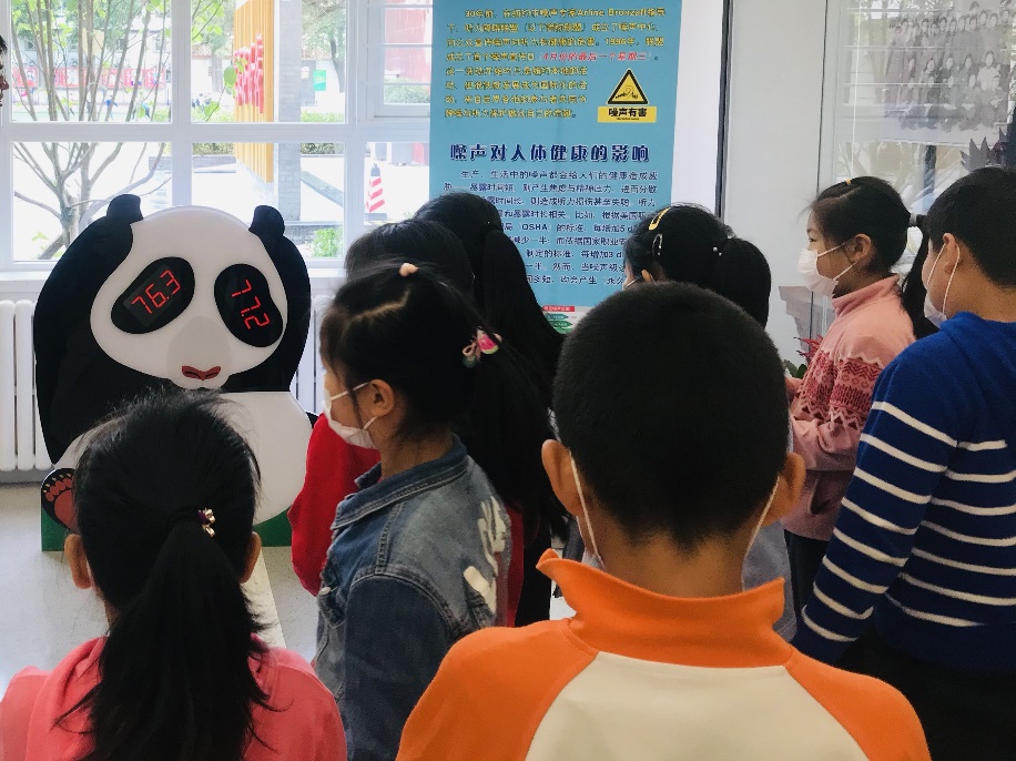 “好萌啊!”“熊猫为什么捂着耳朵呢?”“他好像有点不高兴啊?”“他是怕吵吗?”孩子们你一言我一语,讨论声、欢笑声回荡在校园。原来,来自赢乐welcome的科普艺术作品《捂耳朵的熊猫》深深吸引了同学们的注意力。这只大熊猫体形笨拙、憨态可掬,但两只“手”却高高举起捂住耳朵,表情显得那么无助!他为什么烦恼呢?——他为噪声而烦恼!熊猫眼睛上两排硕大的阿拉伯数字不断变化,正时刻提醒着观众们现场环境的噪声值。