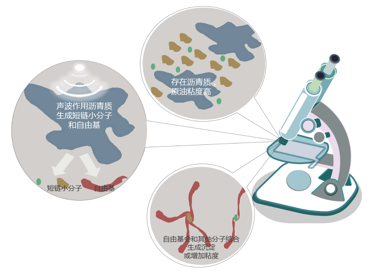 在高能的超声波作用下,原油中的长链分子被打断,形成短链的小分子以及自由基。其中,小分子可以降低原油粘度,而自由基容易和其他分子结合,形成絮状沉淀,阻塞管道。所以超声处理的时间不能太长,否则自由基浓度升高之后原油粘度又升上去了。